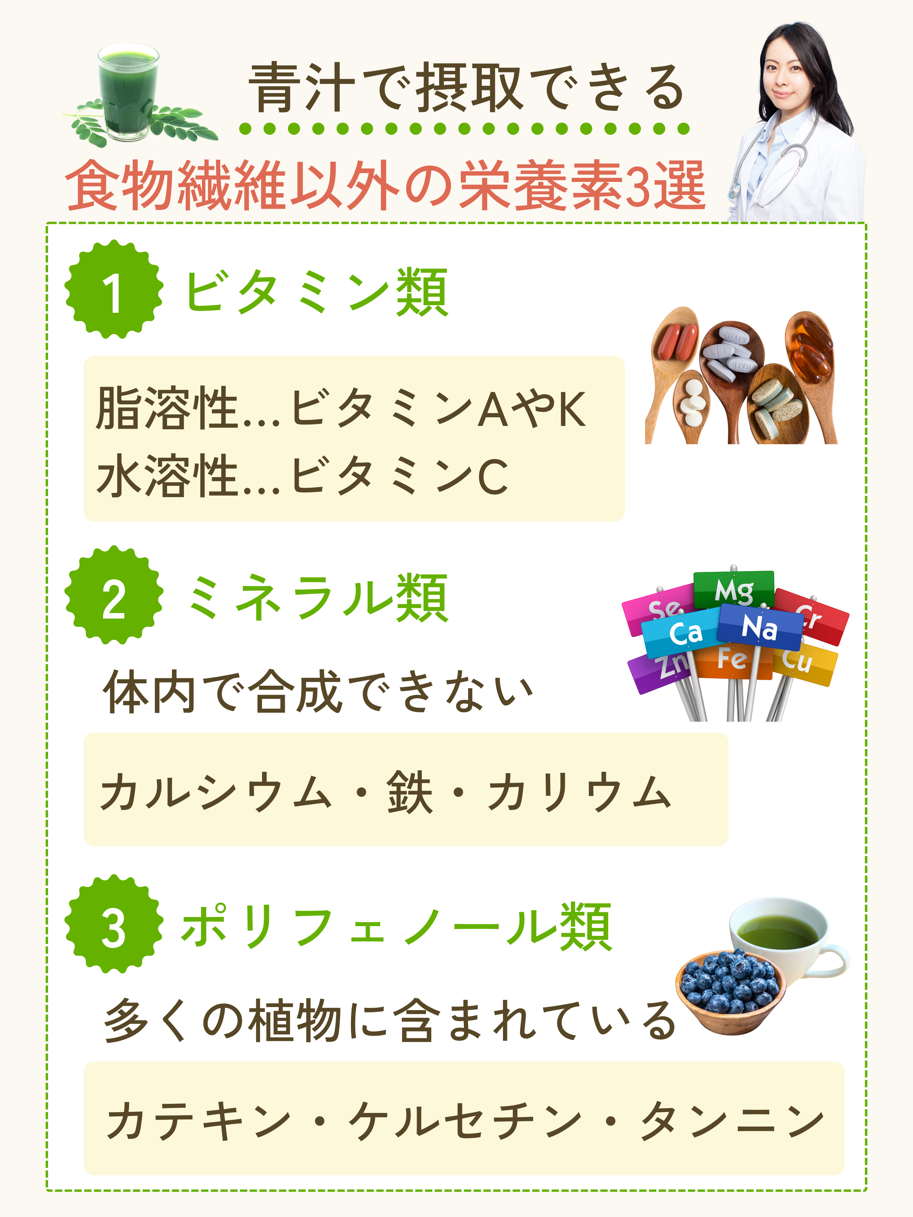 青汁は食物繊維以外にも、以下の栄養素を手軽に補給できます。