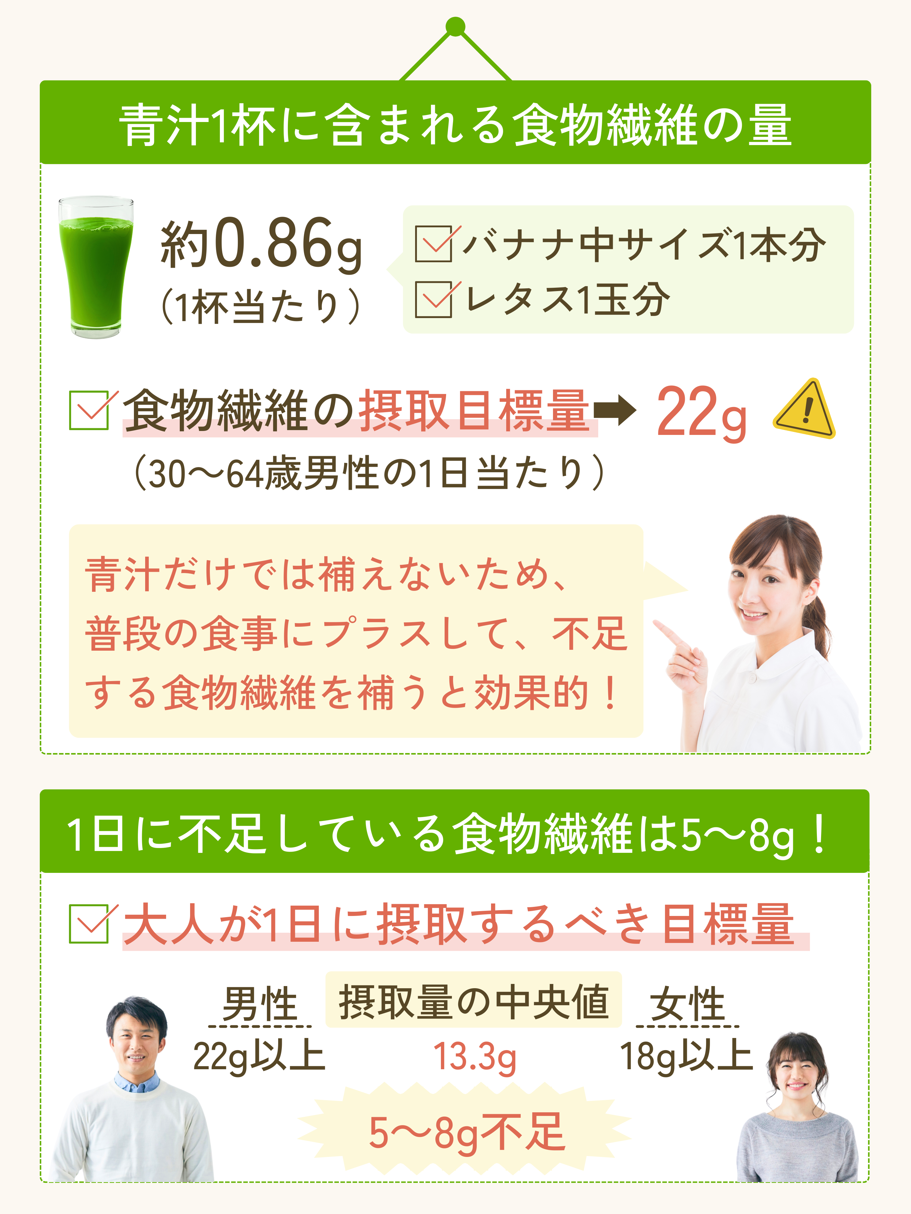 しかし、食物繊維の摂取目標量は1日当たり22g(30~64歳男性)のため、青汁だけで補うことは困難です。青汁を普段の食事にプラスし、不足する食物繊維を補うと効果的です。