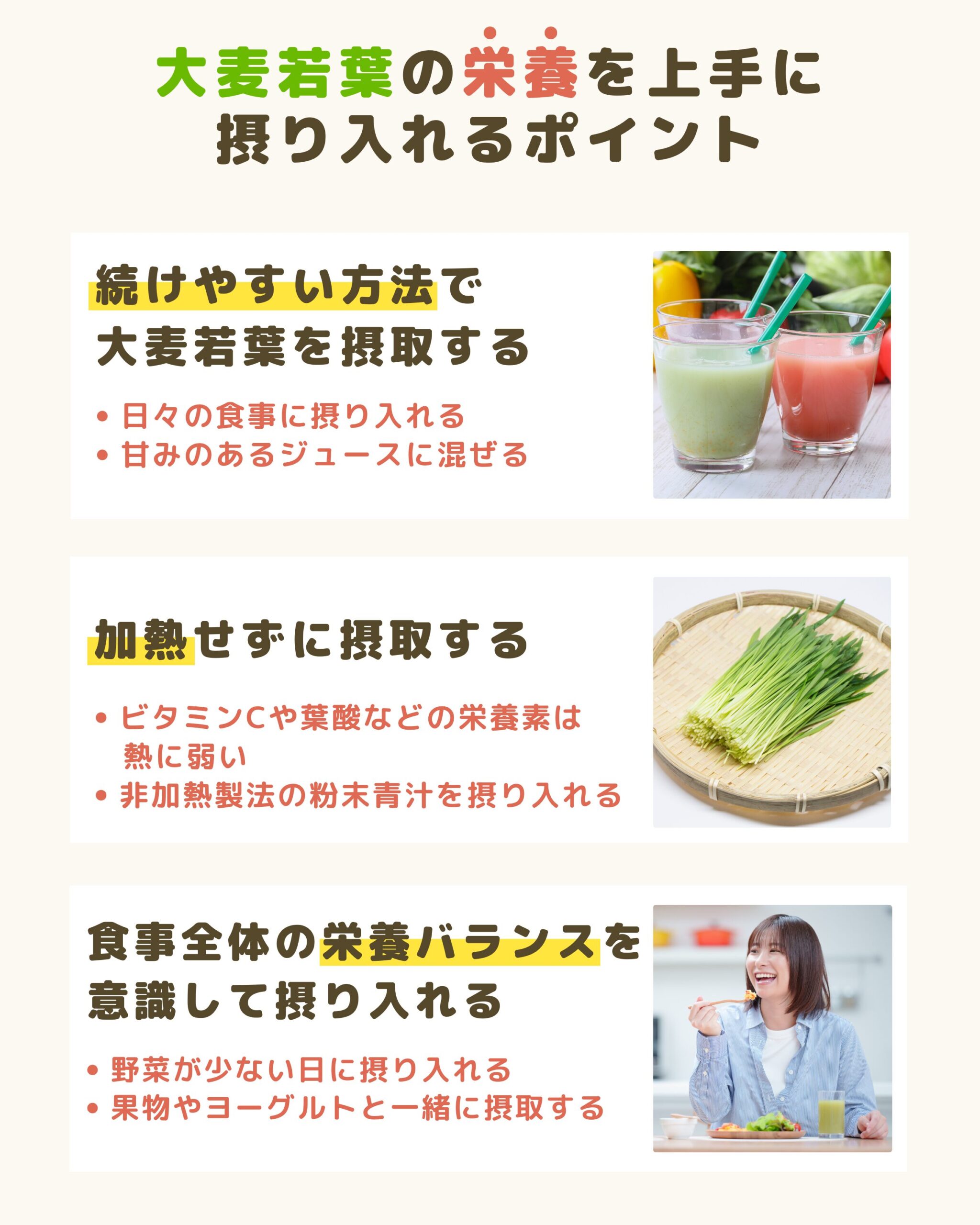 以下のポイントを意識すると、大麦若葉の豊富な栄養を効率的に摂取できます。