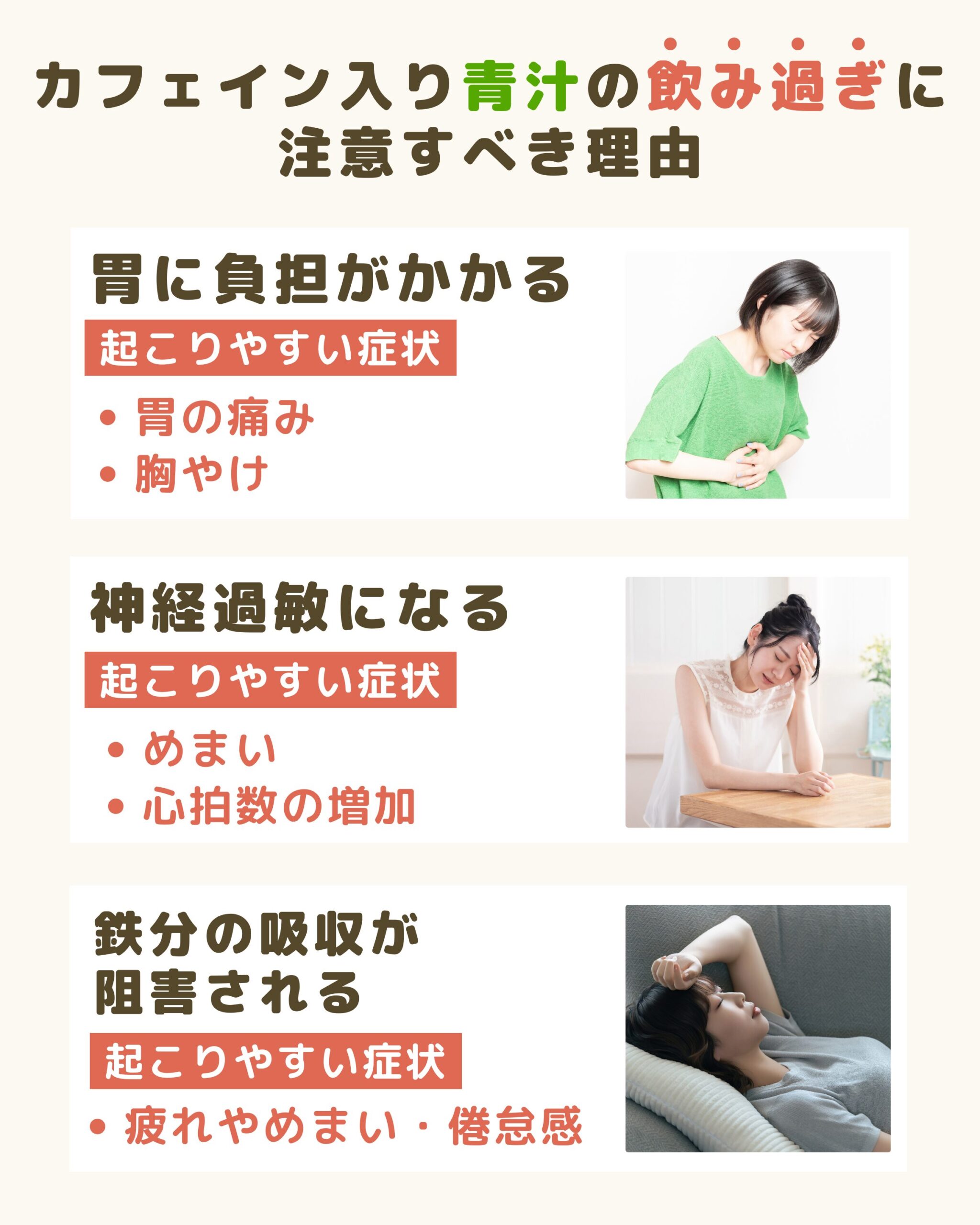 カフェイン入りの青汁を飲むと、以下の影響が出る可能性があるため注意が必要です。