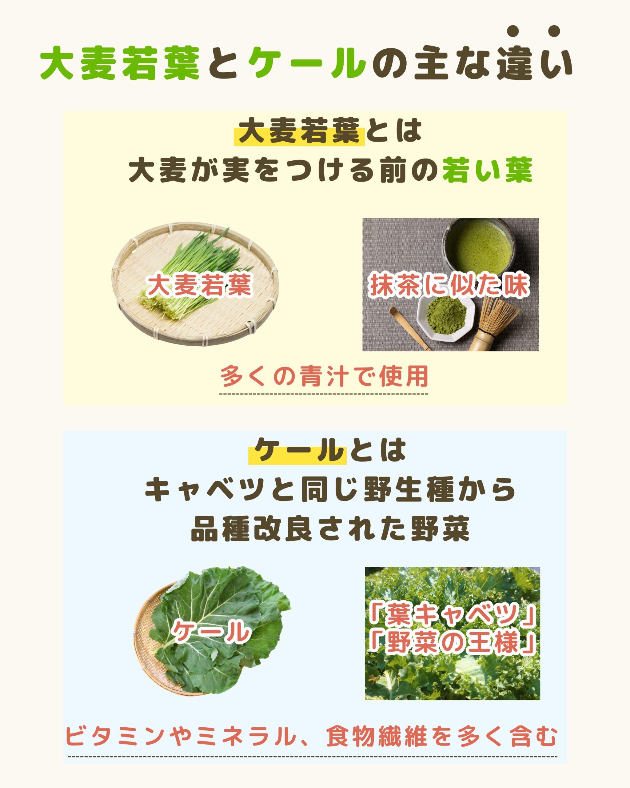 - 青汁を始めたいけど、大麦若葉とケールの違いがわからない