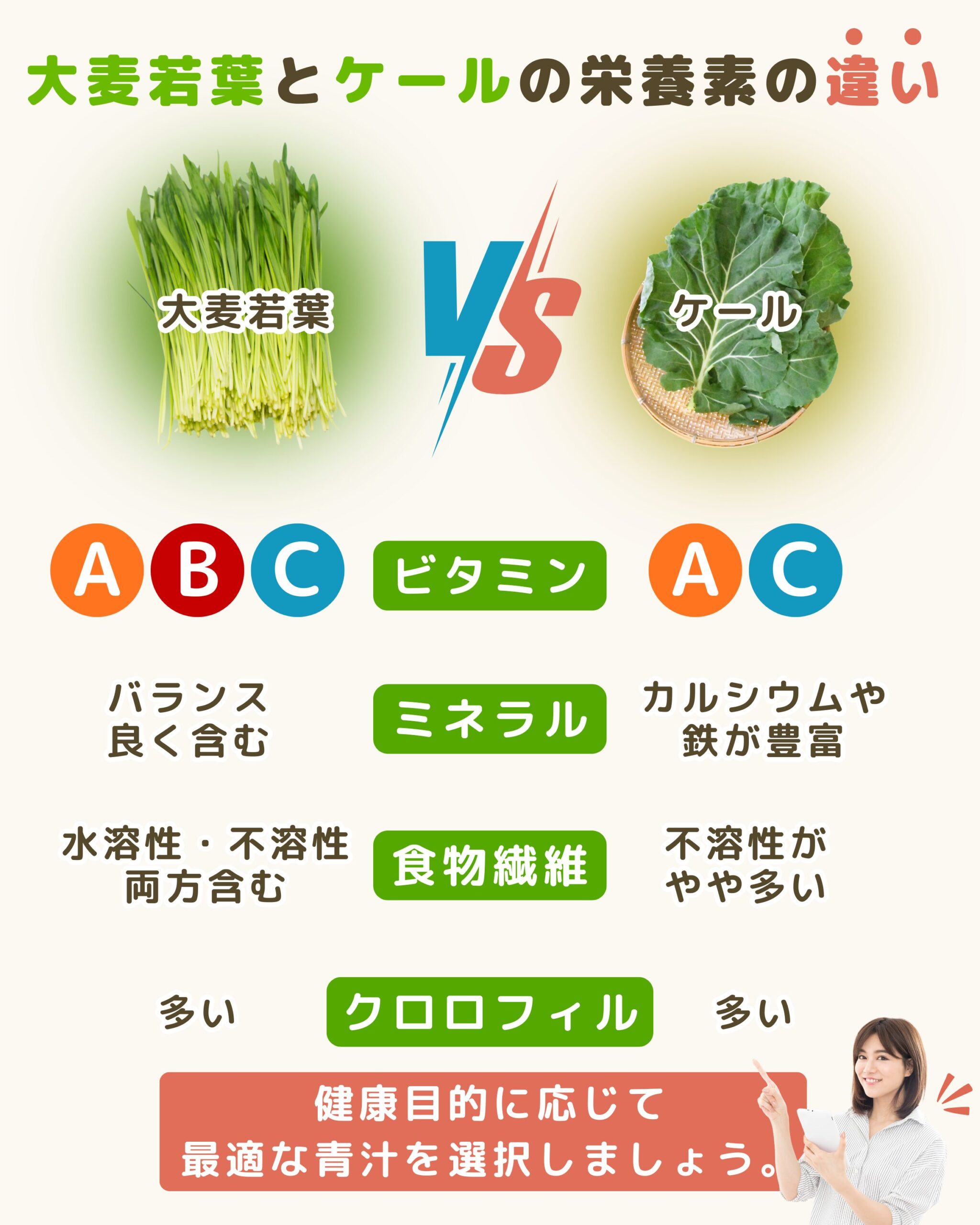 大麦若葉とケールの栄養素の違いを理解することで、健康目的に応じて最適な青汁を選択できるようになります。大麦若葉とケールの栄養素の違いは以下のとおりです。