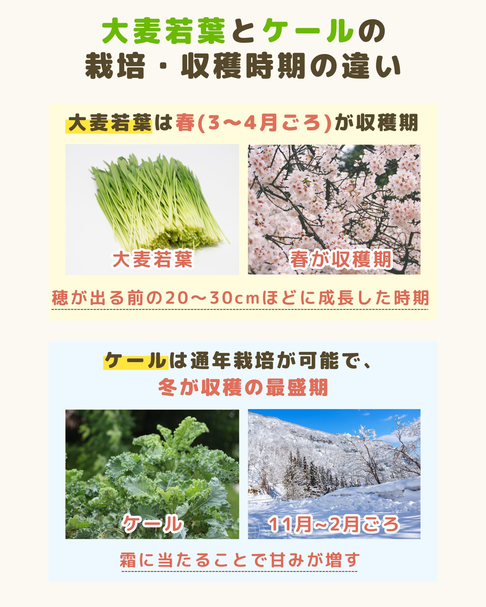 大麦若葉とケールは栽培や収穫の時期に以下の違いがあります。